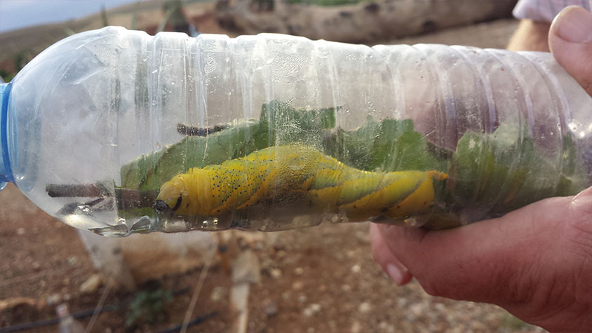 El dueño del huerto donde se encontró el gusano nos ha mandado un poco más de información. Se trata de un Acherontia Atropos, o Esfinge de la Calavera. Este en concreto medía 12 centímetros. Lo van a llevar al mariposario de Benalmádena, donde se quedará hasta que se convierta en mariposa a principios de primavera, por cierto, es la mariposa de El Silencio de los Corderos.