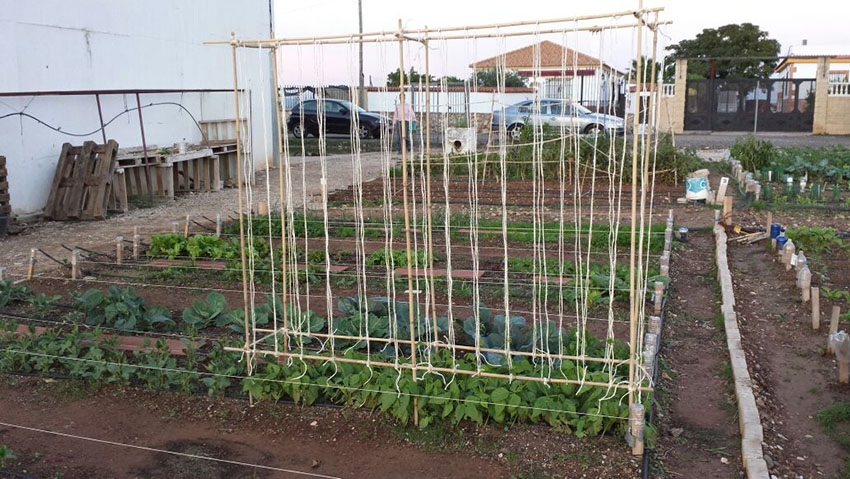 Las judías ya han llegado a una altura que necesitaban las guías para crecer a lo alto.
